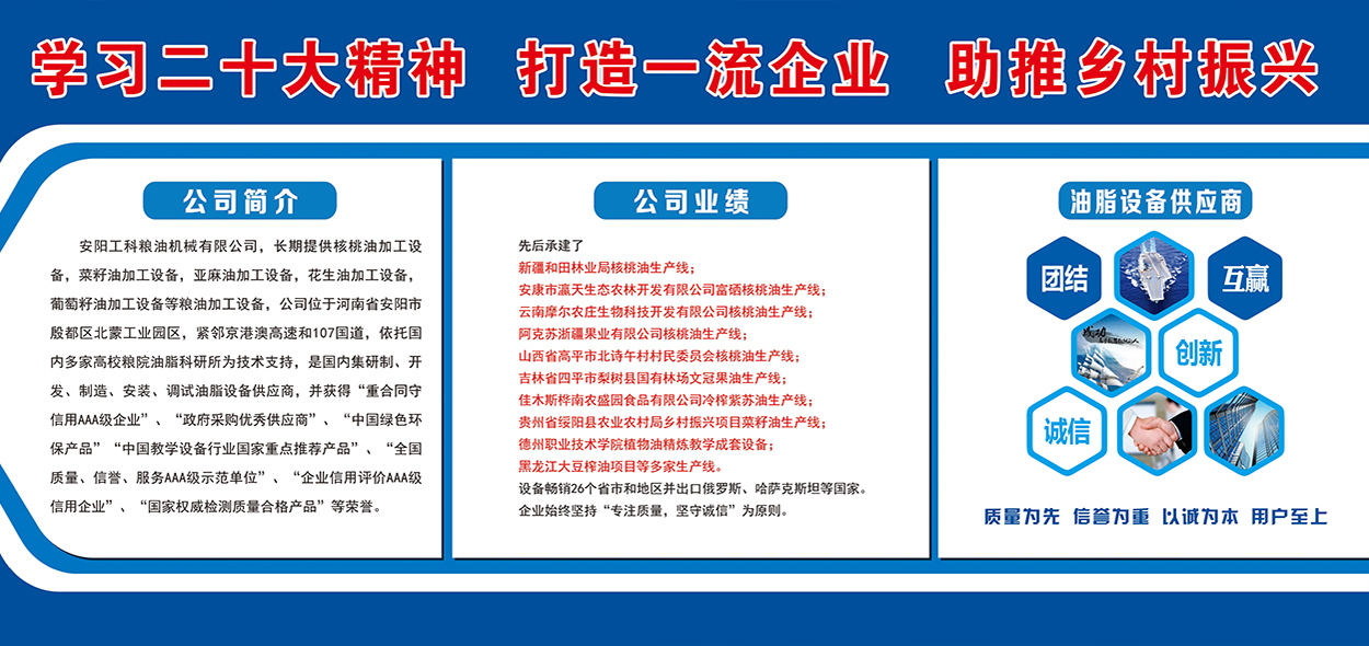 安陽工科糧油機械有限公司,長期提供核桃油加工設(shè)備,茶籽油加工設(shè)備,菜籽油加工設(shè)備,亞麻油加工設(shè)備,花生油加工設(shè)備,葡萄籽油加工設(shè)備等糧油加工設(shè)備,公司位于河南省安陽市殷都區(qū)北蒙工業(yè)園區(qū),緊鄰京港澳高速和107國道,依托國內(nèi)多家高校糧院油脂科研所為技術(shù)支持,是國內(nèi)集研制、開發(fā)、制造、安裝、調(diào)試油脂設(shè)備供應(yīng)商,并獲得“重合同守信用AAA級企業(yè)”、“政府采購優(yōu)秀供應(yīng)商”、“中國綠色環(huán)保產(chǎn)品”“中國教學(xué)設(shè)備行業(yè)國家重點推薦產(chǎn)品”、“全國質(zhì)量、信譽、服務(wù)AAA級示范單位”、“企業(yè)信用評價AAA級信用企業(yè)”、“國家權(quán)威檢測質(zhì)量合格產(chǎn)品”等榮譽。先后承建了新疆和田林業(yè)...